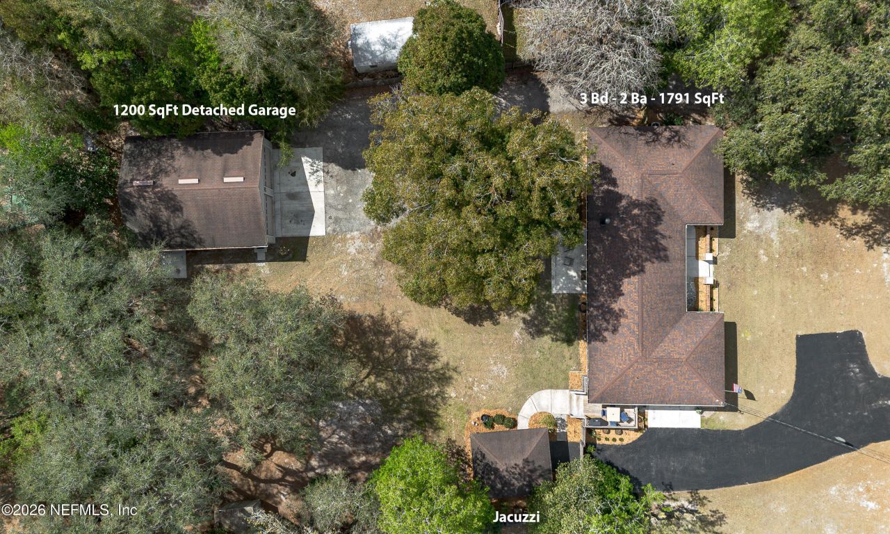 Looking for your favorite place? This beautiful 3-bedroom, 2-bath brick home offers privacy & freedom with no HOA or CDD fees, situated on an acre in Lake Asbury beneath a canopy of oak trees. Enjoy abundant outdoor living spaces, including a side porch with deck, a charming front courtyard entry, and a gazebo-covered hot tub. A standout feature is the insulated 6-car detached garage with 10-foot ceilings, 200-amp service, and two 220 outlets--ideal for car enthusiasts, hobbies, or projects. Inside, the home features fresh paint, brand-new carpet in the bedrooms, newer tile in living areas, & updated low-E windows, including large picture windows & a kitchen bay window. The kitchen offers ample cabinetry & stainless-steel appliances approximately one year old. The spacious family room includes a wood-burning fireplace. Major updates include a 9-year-old roof, 4-year-old HVAC, brand-new water heater, and recently pumped septic. The fenced backyard offers access gates on both sides. This one has the best of both worlds, one acre of property with room to roam yet it is conveniently located close to the First Coast Expressway, shopping, schools, hospitals and more.