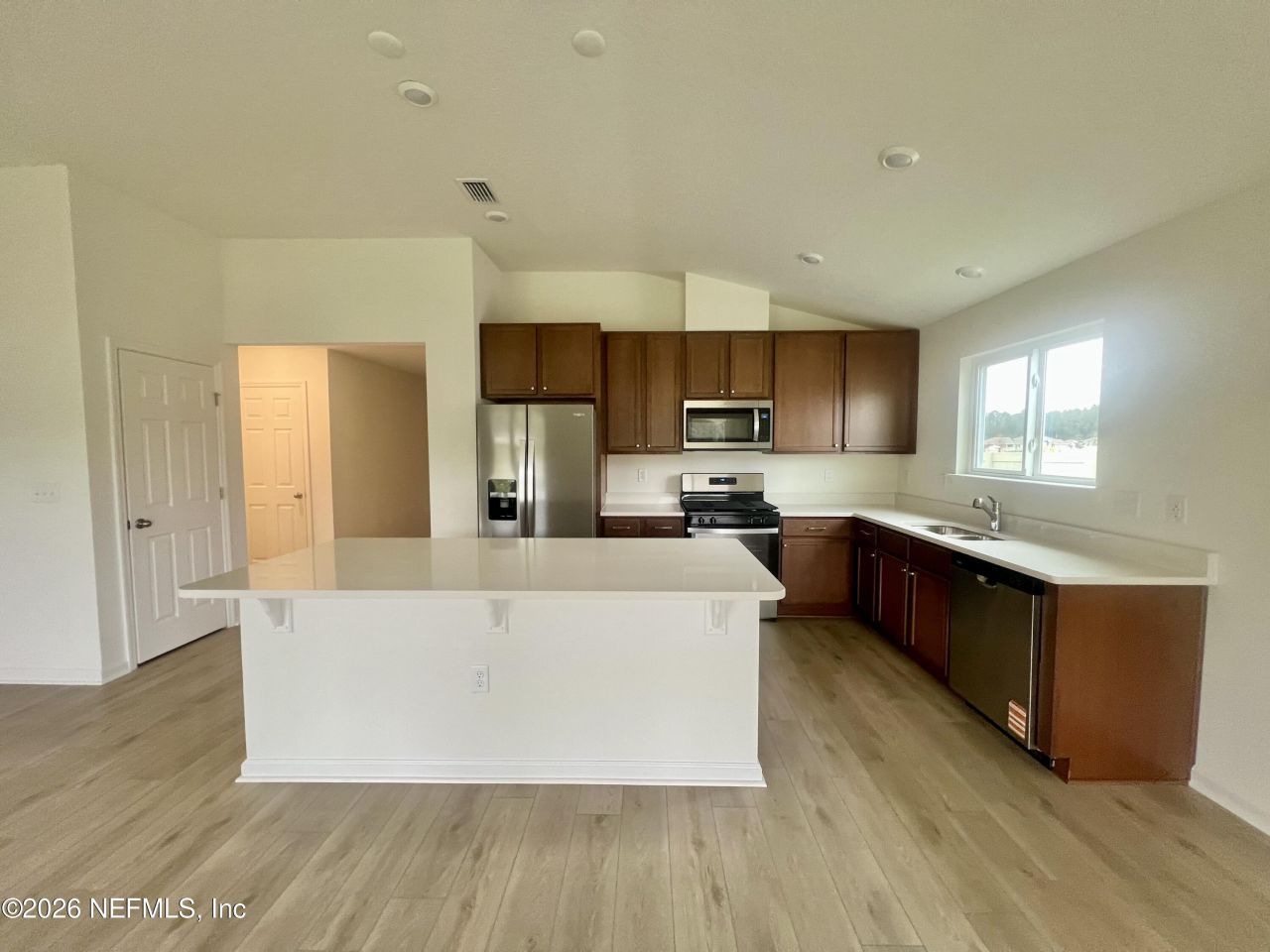 This pond view home features 3 bedrooms, 2 bath and a 2 car garage. The open floor plan showcases volume ceilings and a spacious great room with luxury vinyl flooring. The kitchen boasts white Woodmont 42-in. upper cabinets, an island, quartz countertops and Whirlpool stainless steel appliances. The primary suite features a large walk-in closet and connecting bath that offers quartz countertops and a dual-sink vanity. Enjoy your pond view from your covered patio. Other highlights include dedicated laundry room, ENERGY STAR certified lighting, Moen faucets, Kohler sinks and smart thermostat. KB Home at Anabelle Island pool, dog park and playground are now open! Anabelle Island is a premier natural gas community, offering residents the ability to cook, do laundry, and enjoy hot water heating with natural gas. Closing cost assistance available on this home.