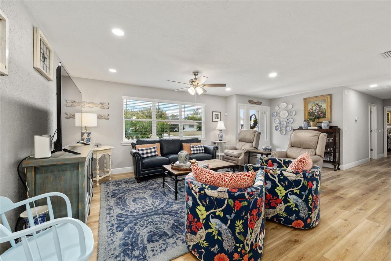 Welcome to this beautifully renovated home in desirable Southeast Ocala, where warmth, natural light, and modern updates come together in a peaceful setting. As you enter, the light-filled family room highlights the open-concept design, creating an inviting space for everyday living and entertaining.The fully renovated kitchen features soft-close cabinetry, granite countertops, a stylish tile backsplash, and stainless steel appliances. Just off the kitchen is a formal dining room and a spacious laundry room with custom cabinetry installed in the past year.The primary suite offers a relaxing retreat with a beautifully updated bathroom featuring granite countertops and a large walk-in shower. Two additional spacious bedrooms and a full hallway bath provide comfortable accommodations for family or guests.Sliding doors from the dining room lead to a back deck with new railings, perfect for morning coffee or evening dinners overlooking the large backyard.Major updates completed in 2023 include: New HVAC system with ductwork Updated electrical and plumbing New roof All new windows and interior/exterior doors (including garage door and opener) New water heater, toilets, sinks, lighting, trim, and flooringThis home truly feels like new construction while being located in an established neighborhood near downtown Ocala, shopping, dining, parks, and schools - many within walking distance.A must-see move-in ready home!