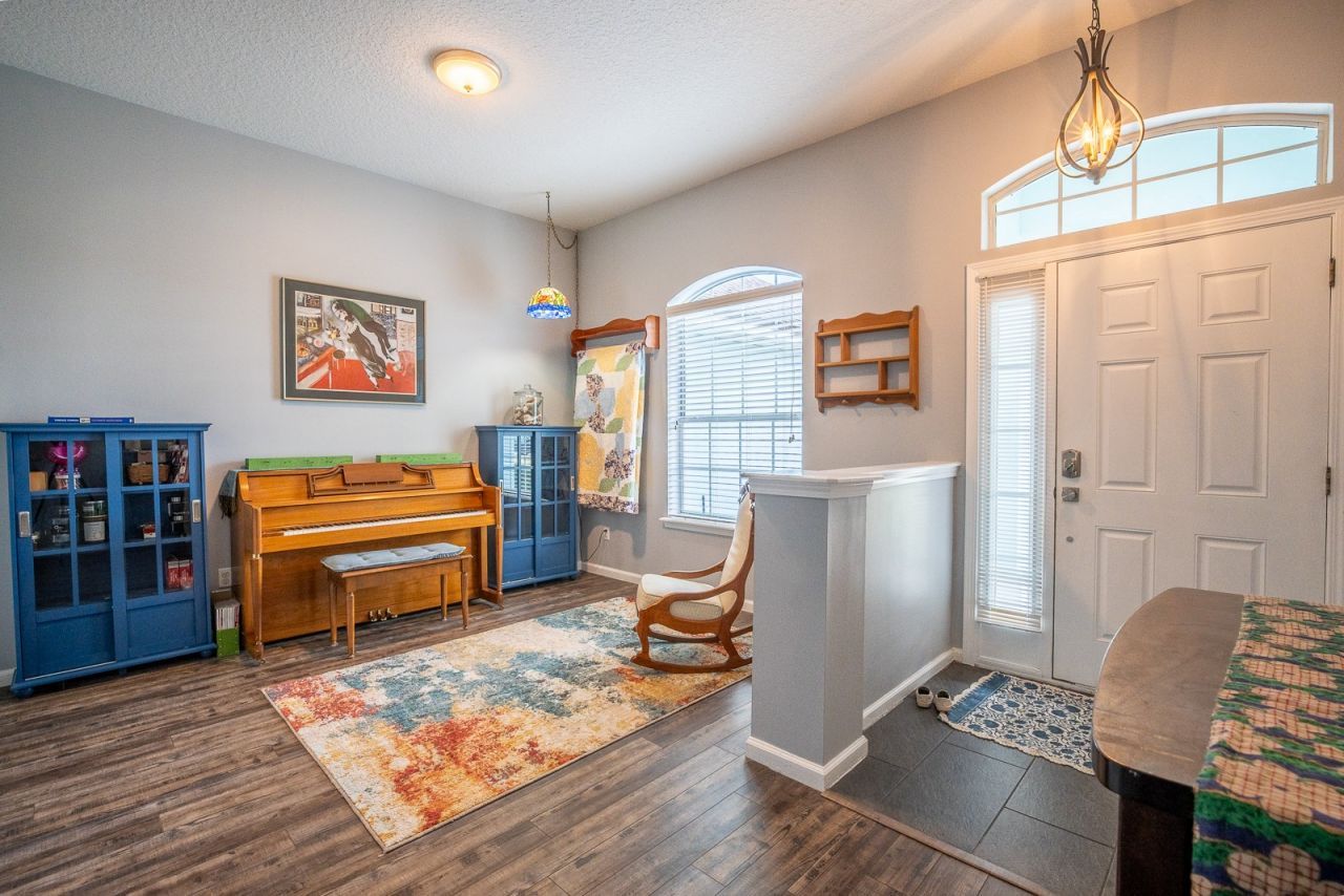 The home features style with a split-bedroom floor plan and an inviting entrance foyer. Relax in the large primary bedroom, which includes a walk-in closet and a newly renovated bathroom equipped with a garden tub, stand-up shower, and a large vanity. The kitchen offers ample counter space, a breakfast bar, and black appliances, flowing into a formal dining room. Home has vinyl flooring throughout, and offers ample storage and a two car garage.