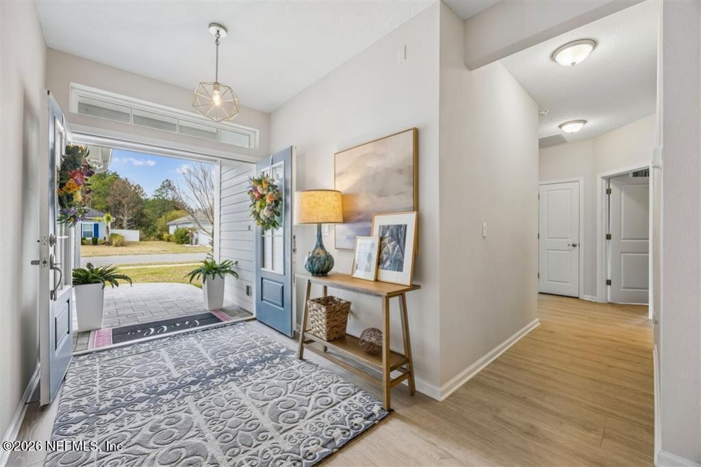 Beautifully maintained single-level home tucked away on a quiet cul-de-sac preserve lot in the desirable Amelia Concourse area of Fernandina Beach. This spacious 5-bedroom, 2-bath home offers 2,215 sq ft with an open layout designed for comfortable living and easy entertaining. Double front doors welcome you into a bright interior featuring 9' ceilings, luxury vinyl plank flooring, and pocketing sliding glass doors that create seamless indoor-outdoor living. The kitchen includes quartz countertops, extended cabinetry, stainless steel appliances, and natural gas, flowing into the main living area. A mudroom with built-ins keeps daily life organized, while the flexible fifth bedroom works perfectly as an office or guest space. Enjoy the shark-coated screened lanai, paver patio, and fully fenced backyard overlooking peaceful preserve views. Community amenities include a pool, splash zone, and sidewalks, all just 15-20 minutes to the beach and 35-40 minutes to Jacksonville airport.