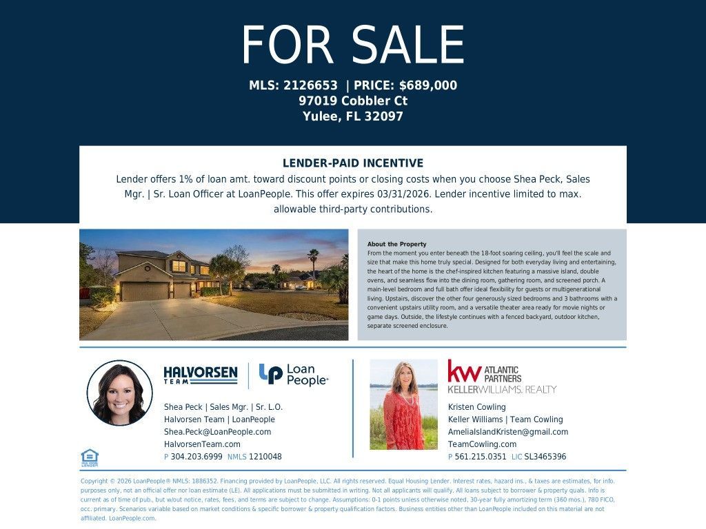 **Lender-Paid Incentive of 1% of loan amount toward discount points or closing costs (limited to max. allowable third party contributions) being offered through 3/31/2026** Step into this impressive 4,075-square-foot, two-story home with a 3 car garage tucked away on a quiet cul-de-sac in a gated community. From the moment you enter beneath the 18-foot soaring ceiling, you'll feel the scale and size that makes this home truly special. Designed for both everyday living and entertaining, the heart of the home is the chef-inspired kitchen featuring a massive island, double ovens, and seamless flow into the dining room, gathering room, and screened porch. A main-level bedroom and full bath offer ideal flexibility for guests or multigenerational living. Upstairs, discover the other four generously sized bedrooms and 3 bathrooms with a convenient upstairs utility room, and a versatile theater area ready for movie nights or game days. Outside, the lifestyle continues with a fenced backyard, outdoor kitchen, separate screened enclosure, plus the practicality of a separate irrigation well and utility shed and room to add a pool! Located in Nassau County, home to A-rated schools, this home is 12 miles from historic downtown Fernandina Beach and the wide, sandy shores of Amelia Island, and only minutes from I-95, Jacksonville International Airport, and local military bases.